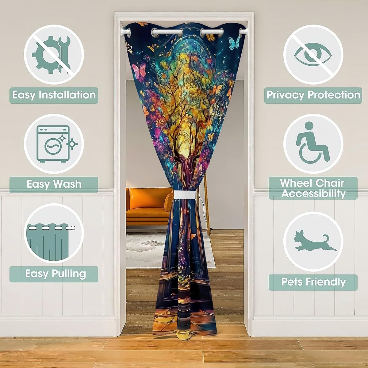 Package Include: 1 Door Panel 100% polyester, soft, block out 30% to 50% sunlight Size Information: 6 Sizes for you to choose 34W x 80L inch 42W x 80L inch 52W x 80L inch 60W x 80L inch 42W x 84L inch 52W x 84L inch Occasion: Used us door curtain, wall tapestry, window drapes. Suitable for home, office, restaurant, dinning area, windows, kitchen, toilet, bathroom, bedroom and etc. Washing instructions: Machine washable in gentle cycle and cold water, do not bleach. Warm iron and tumble dry at low temperatures Warm Tips: Not blackout curtains or light blocking curtains or energy saving curtains. Patterns are printed on one side. Manual measurement, please allow an error of 1 to 3cm.