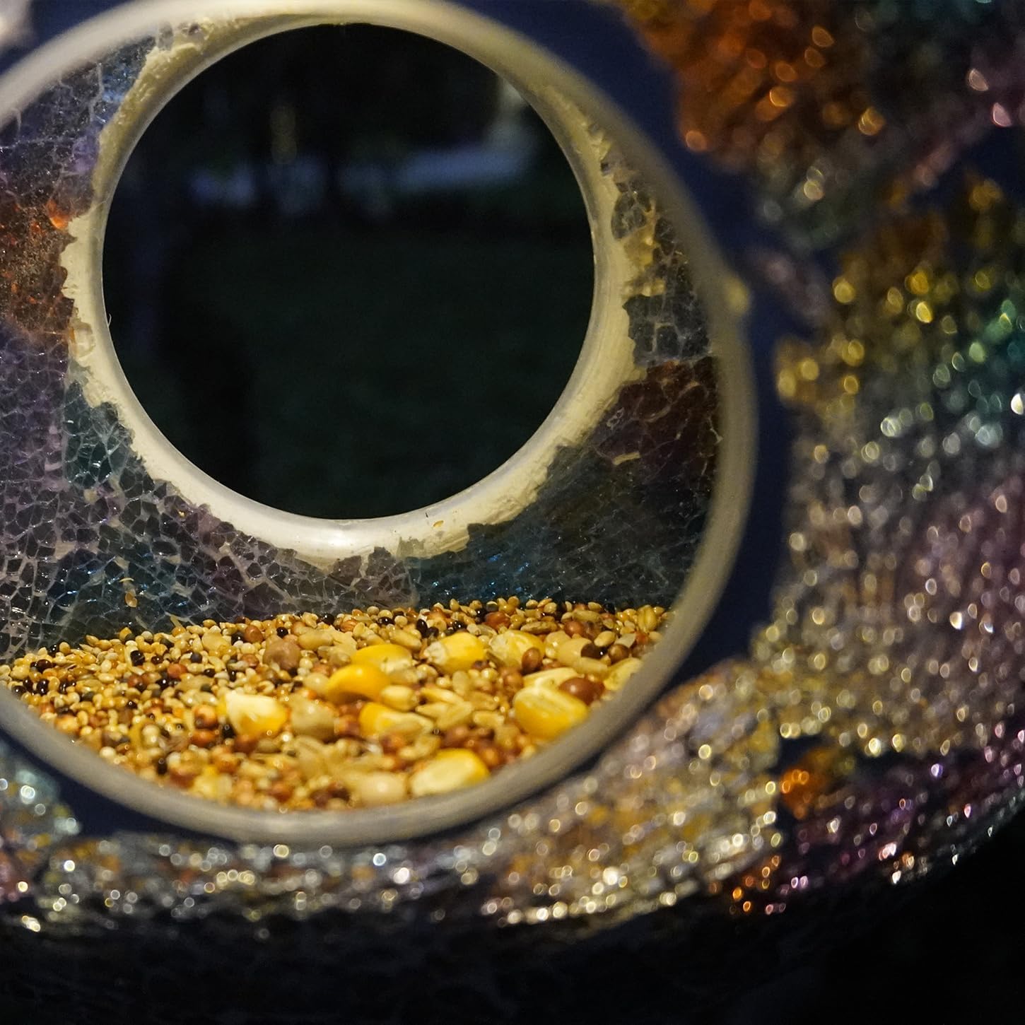 Teravem Solar Bird Feeder - Garden Elegance & Night MagicIlluminate and captivate with Teravem's solar bird feeder, blending bird care and solar charm. Durable metal, a glass shade, and a butterfly accent make this feeder resilient and stylish in your garden.Solar BrilliancePowered by solar panels, this feeder turns into a warm LED display at dusk, perfect for bird watching and adding a touch of enchantment to your outdoors.Efficient & ElegantDurable construction hangs effortlessly, while a vibrant blue flower design adds elegance. Improved solar tech ensures 6 hours of colorful lighting with minimal charging time.Specifications:Battery: Ni-MHMaterial: Metal & GlassWaterproof: IP65Working Time: 4-6 hours after 8-12 hours of sunlightNote:Colors may vary slightly due to lighting.Embrace the intentional "rustic" appearance for added charm.