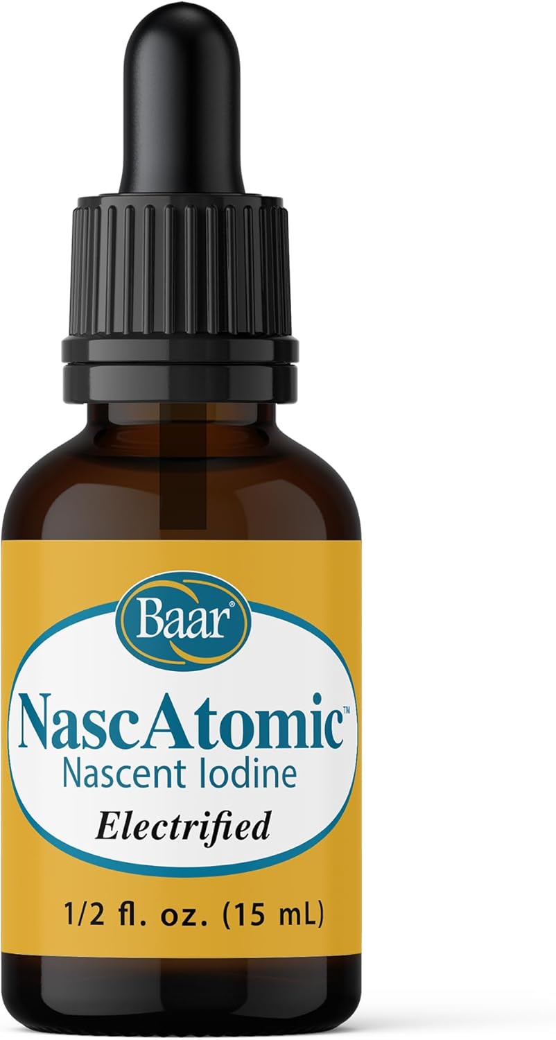 Why do I Need Iodine? Nascent Iodine is extremely important for absorbability into the body's system. Iodine is used by every hormone in the body. Primary uptake is in the Thyroid, then preferentially distributed to receptors throughout the whole body including breast, stomach, intestines, liver, kidneys, nerves, brain and every molecule including DNA. Seaweed, seafood, greens, raw sunflower seeds are good sources of Iodine, but may not have the levels necessary to fully support good homeostasis in the body. A sufficient supply of Iodine is crucial for synthesis of Thyroid hormones and for its the normal function. A lack of Iodine allows other halogens, such as Bromine and Chlorine, to masquerade as Iodine, causing harm to the body. Signs of Iodine deficiency include: Unusual fatigue, Stubborn weight gain, Irregular bowel movements, Lifeless skin, Occasional aches and stiffness, and Bouts of sadness. Why is NascAtomic Different? Baar Products has over 25 years of experience electrifying Iodine. The quality that separates NascAtomic from all other iodine products is that the diatomic bond is broken, liberating the Iodine element in an atomic or nascent state. This is done by the process of electrifying the solution which allows the Iodine atoms to each keep one of the two electrons that had made up the covalent bond. This is known as homolytic cleavage and creates an electromagnetic charge to the Iodine. That means your body is able to use it more efficiently. In this form, the body can readily assimilate and use the Iodine and convert it to be easily used by the body. The Iodine being in the atomic state was the reason it was called Atomidine or Atomic Iodine. Tested Free of Radio-Activity.