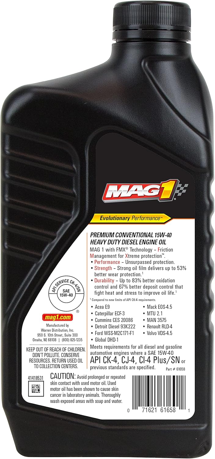 Product Description MAG 1® Premium Conventional 15W-40 CK-4 is technologically advanced heavy duty diesel engine oil that provides outstanding performance Amazon.com Motor oil is made from crude oil and is used to lubricate, clean, and cool engines. Types of motor oil include conventional, synthetic, diesel, bio-based, hybrid (blends of conventional and synthetic), and recycled oils. Motor oil varies in weight and viscosity, as well as additives that some manufacturers add to the oil during the refining process. A numerical code system created by the Society of Automotive Engineers (SAE) grades motor oils according to viscosity--the higher the number between 0 and 60, the more viscous (thicker) the oil is. Most consumer motor oils are graded by two numbers, with the first number indicating cold weather (Winter or "W") performance.SAE 15W-40This oil has a weight of SAE 15W-40, meaning it has an SAE viscosity rating of 15 in cold temperatures and a rating of 40 at normal operating temperature. Always check your vehicle's owner's manual to verify that this is the correct weight of motor oil for your vehicle.Conventional Motor OilThis oil is a conventional motor oil, meaning it is refined from crude oil or petroleum products. Conventional motor oils may or may not have additives included after refining. Conventional motor oils are more versatile than synthetic or hybrid motor oils, because they are suitable for use with nearly all types of modern vehicle engines, from cars and trucks to motorcycles, ATVs, farm equipment, and more.